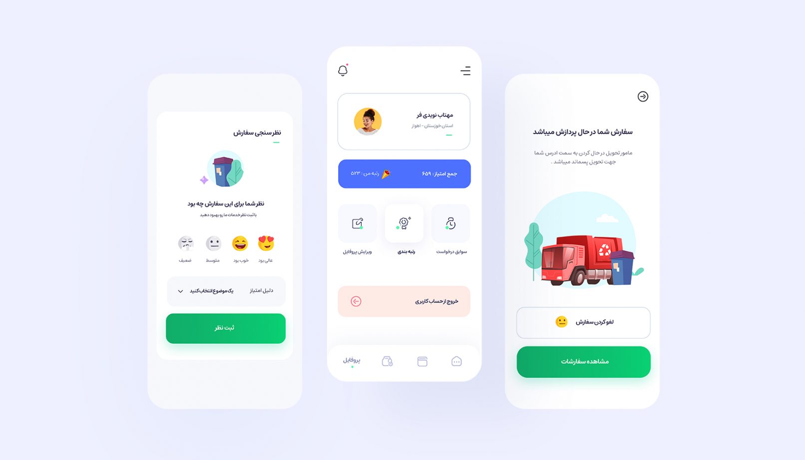 در واقع میبایست بهروب هویت و تجربه کاربری منحصر به خودش را در ذهن کاربران ثبت میکرد و از طریق ایجاد پروسه ای راحت برای ارسال های درخواست جمع آوری های پسماند کاربران که برای آن ها عملیاتی بود که شاید در طول هفته چندین بار انجام میداند ، تمایزی در طراحی رابط کاربری اپلیکیشن بهروب ایجاد شود  لذا در طراحی و چیدمان تجربه کاربری با ایجاد تسهیل در پروسه های سفارش گذاری و استفاده از پالت رنگی مرتبط با محیط زیست برای انتقال حس هم جهت با رویکرد برند و فعالیت آن خروجی مطلوب حاصل شده است .