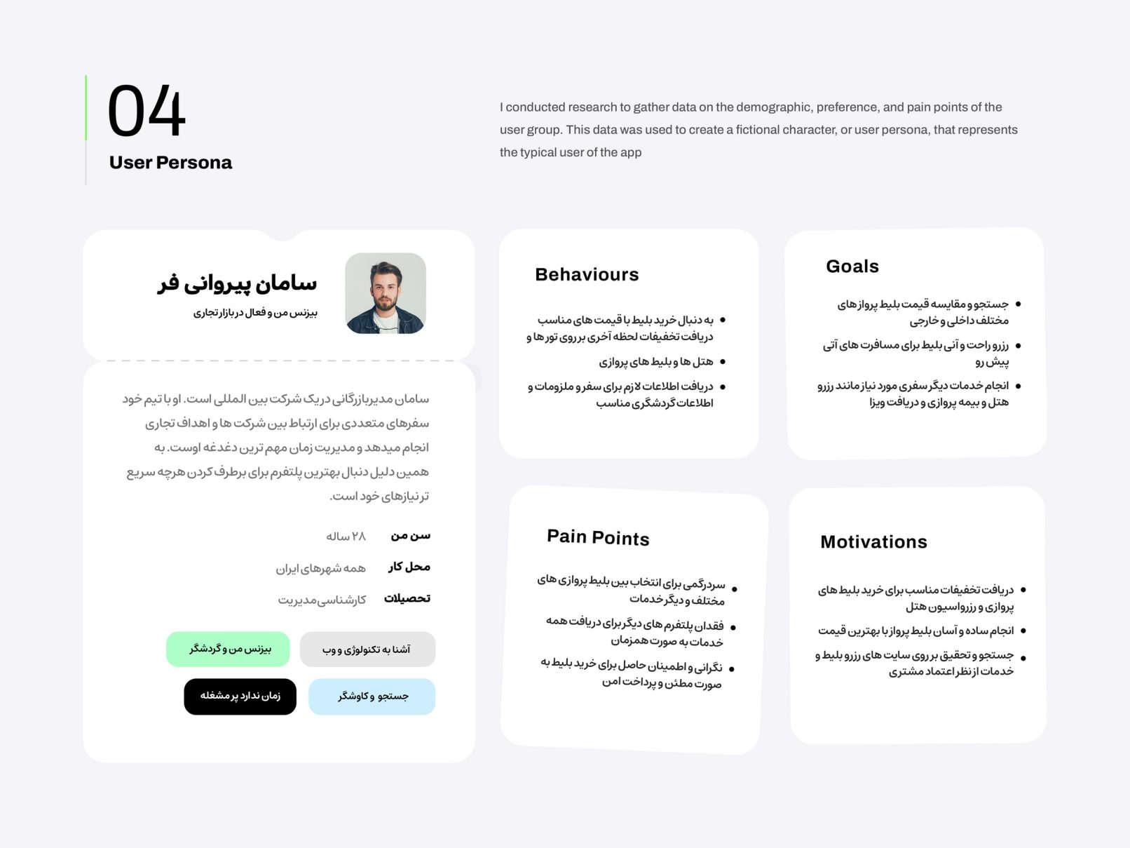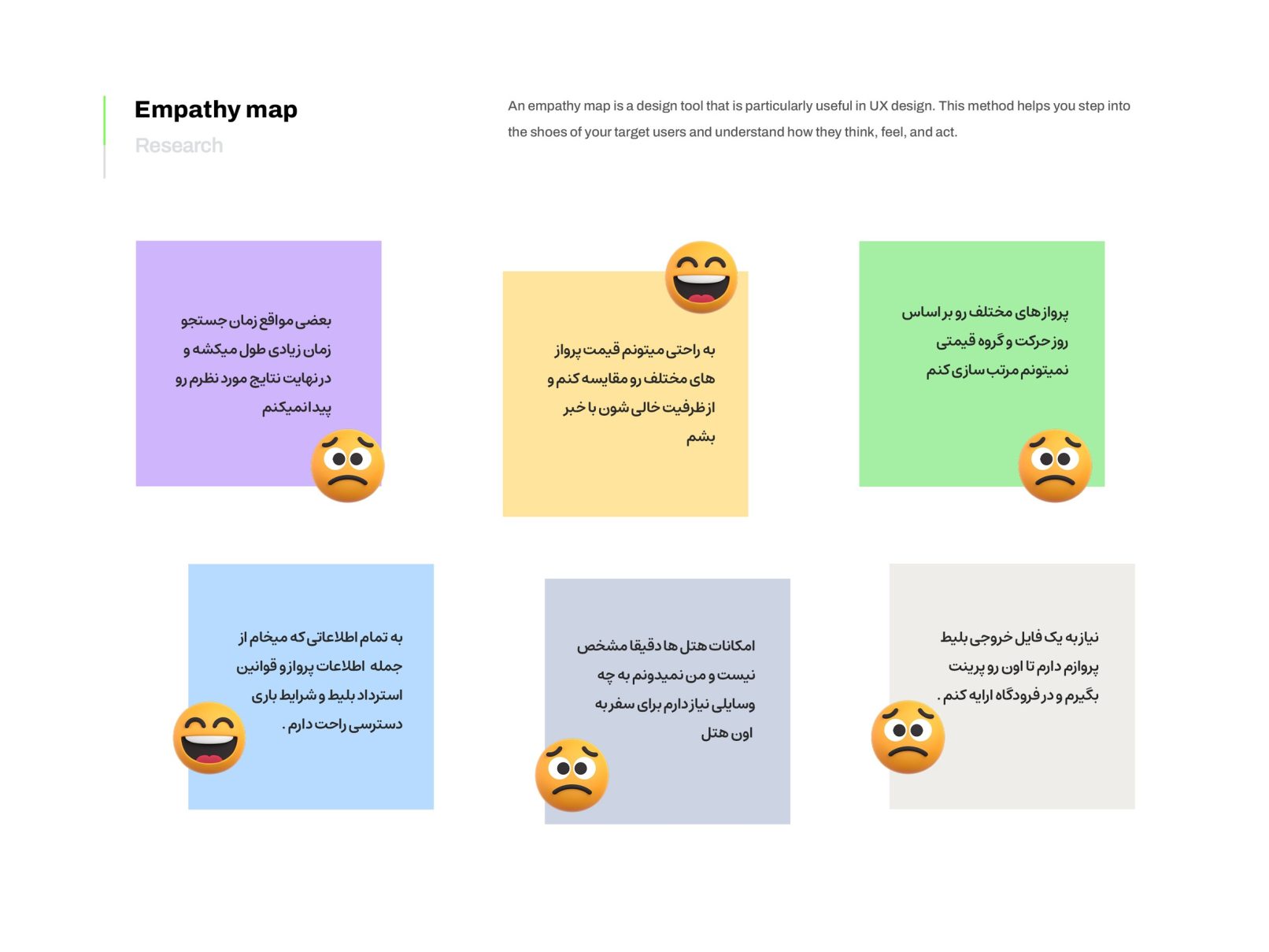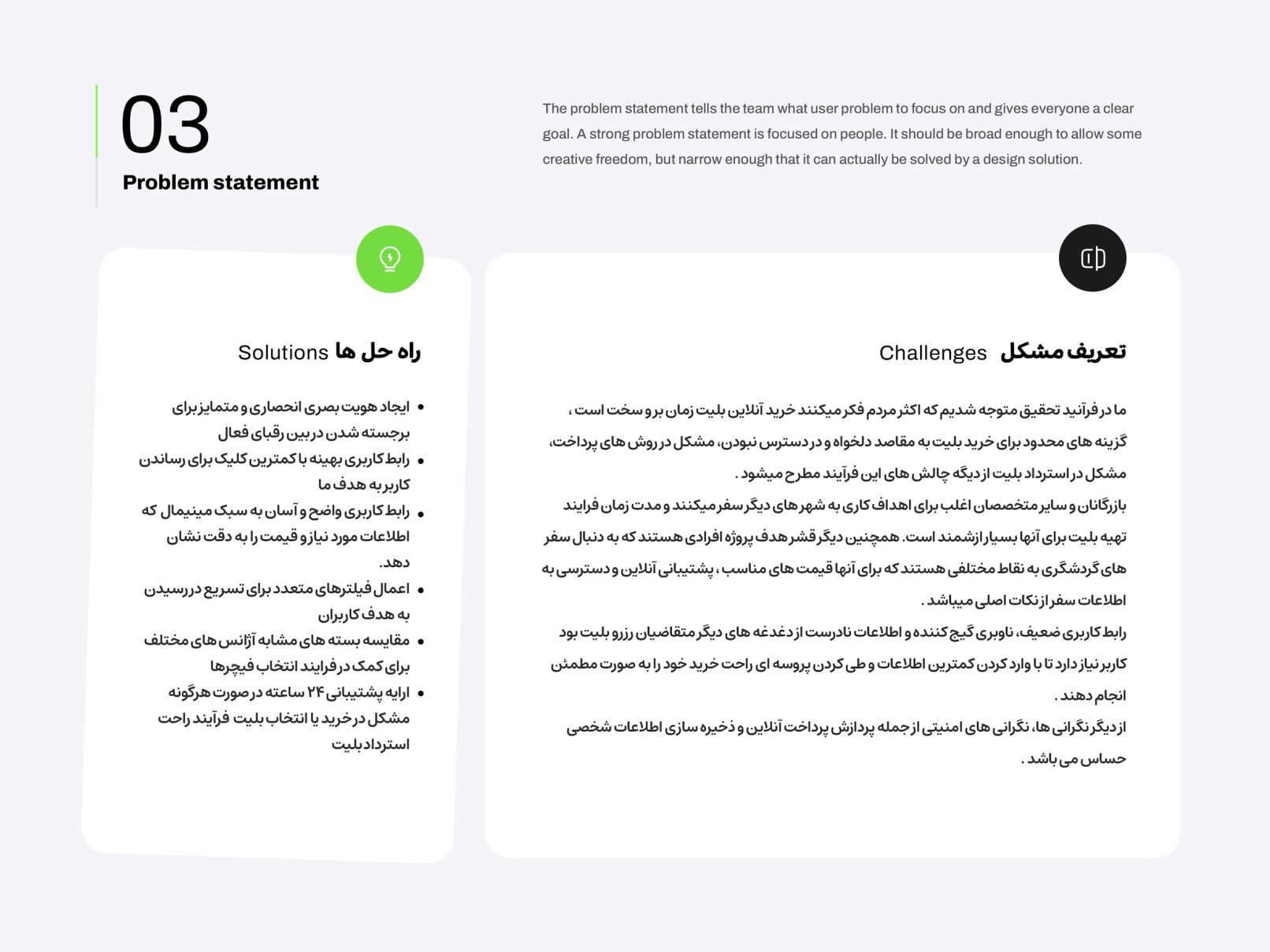 ما در فرآنید تحقیق متوجه شدیم که اکثر مردم فکر میکنند خرید آنلاین بلیت زمان بر و سخت است ، گزینه های محدود برای خرید بلیت به مقاصد دلخواه و در دسترس نبودن، مشکل در روش های پرداخت، مشکل در استرداد بلیت از دیگه چالش های این فرآیند مطرح میشود . همچنین وجود فیچر های مختلف در بخشهای مختلف وبسایت و اپلیکیشن و نیاز به چیدمان بهینه و دردسترس کاربر از دیگر چالش های پیش رو بود .