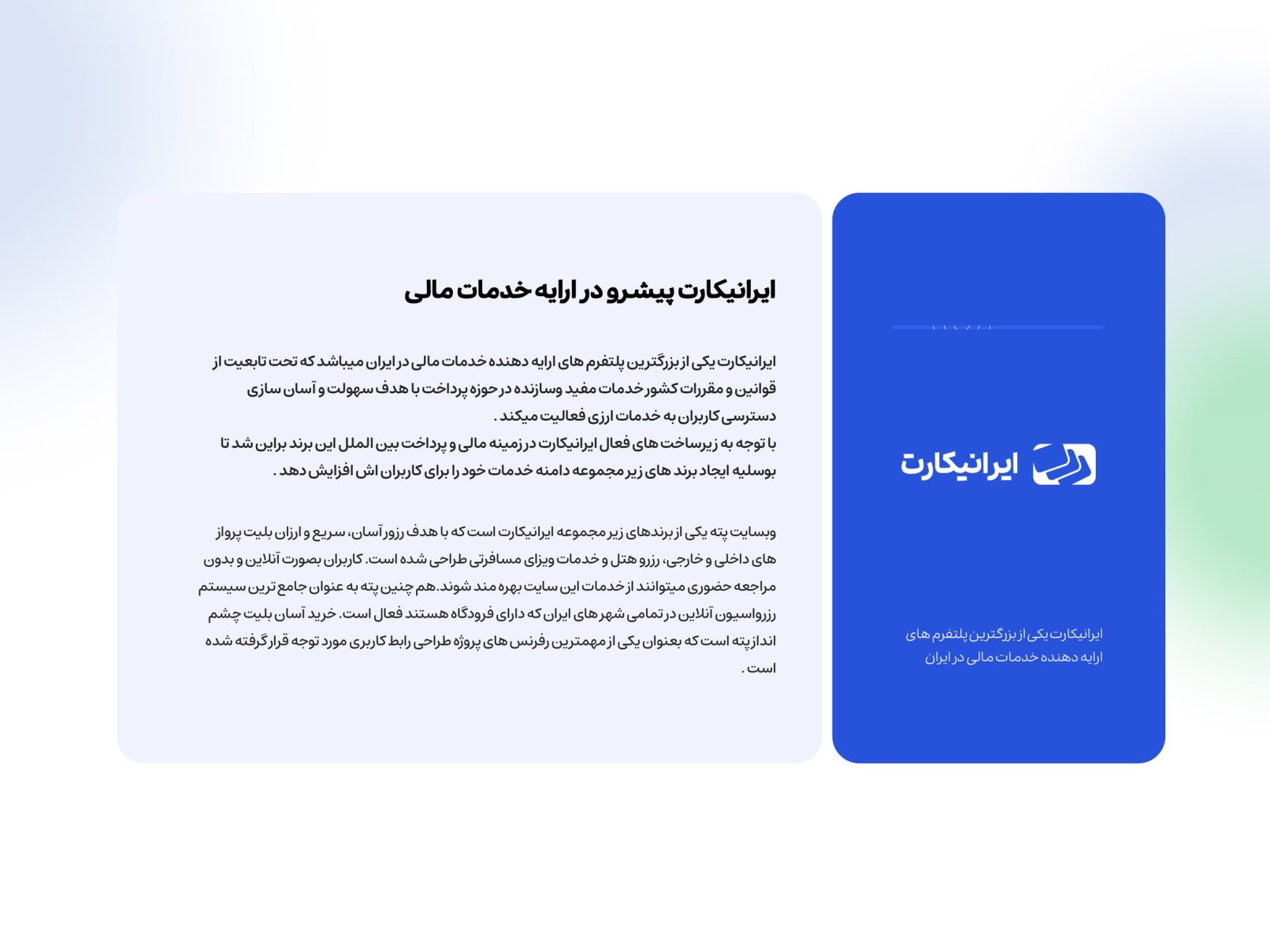 ایرانیکارت یکی از بزرگترین پلتفرم های ارایه دهنده خدمات مالی در ایران میباشد که تحت تابعیت از قوانین و مقررات کشور خدمات مفید وسازنده در حوزه پرداخت با هدف سهولت و آسان سازی دسترسی کاربران به خدمات ارزی فعالیت میکند .با توجه به زیرساخت های فعال ایرانیکارت در زمینه مالی و پرداخت بین الملل این برند براین شد تا بوسلیه ایجاد برند های زیر مجموعه دامنه خدمات خود را برای کاربران اش افزایش دهد .