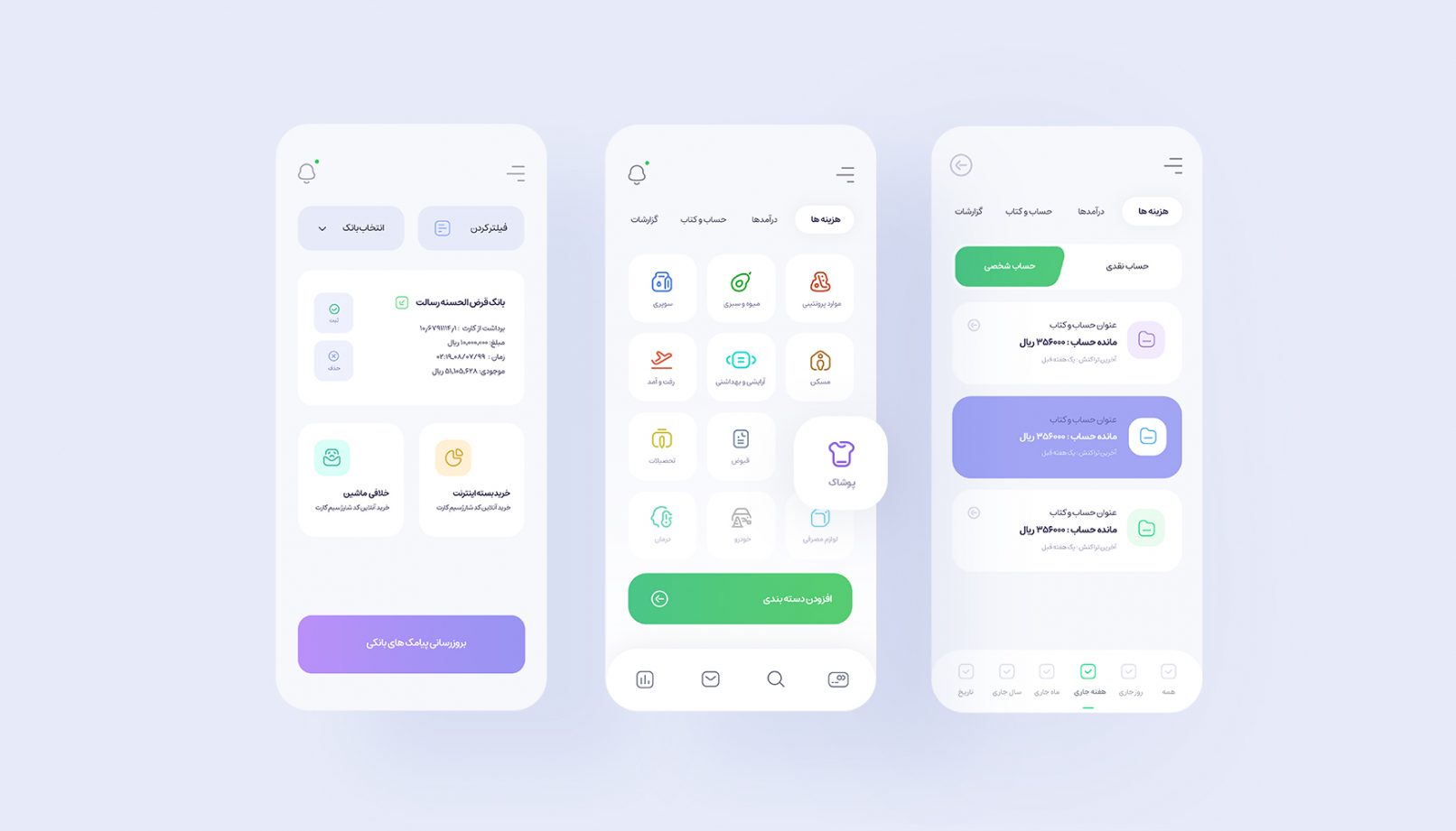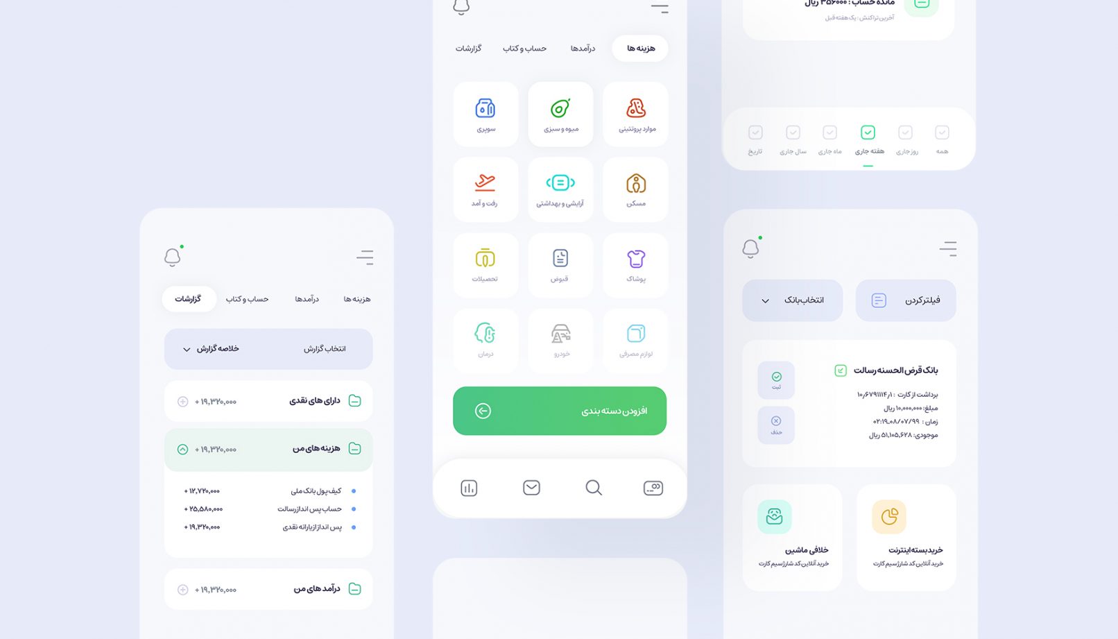 در طراحی رابط کاربری اپلیکیشن مدیریت مالی با استفاده از پالت رنگی روشن در کنار رنگ های مختلف بعنوان رنگ های ثانویه و تحلیل و بررسی داستان و جریان کاربری عملیات ثبت تراکنش های روزانه در دسته بندی های مختلف تعریف شده ، از اصلی ترین فعالیت کاربران در این اپلیکیشن بشمار می آید ، همچنین در طراحی تجربه کاری سادگی و راحتی پروسه گزارش گیری مد نظر بوده است .
